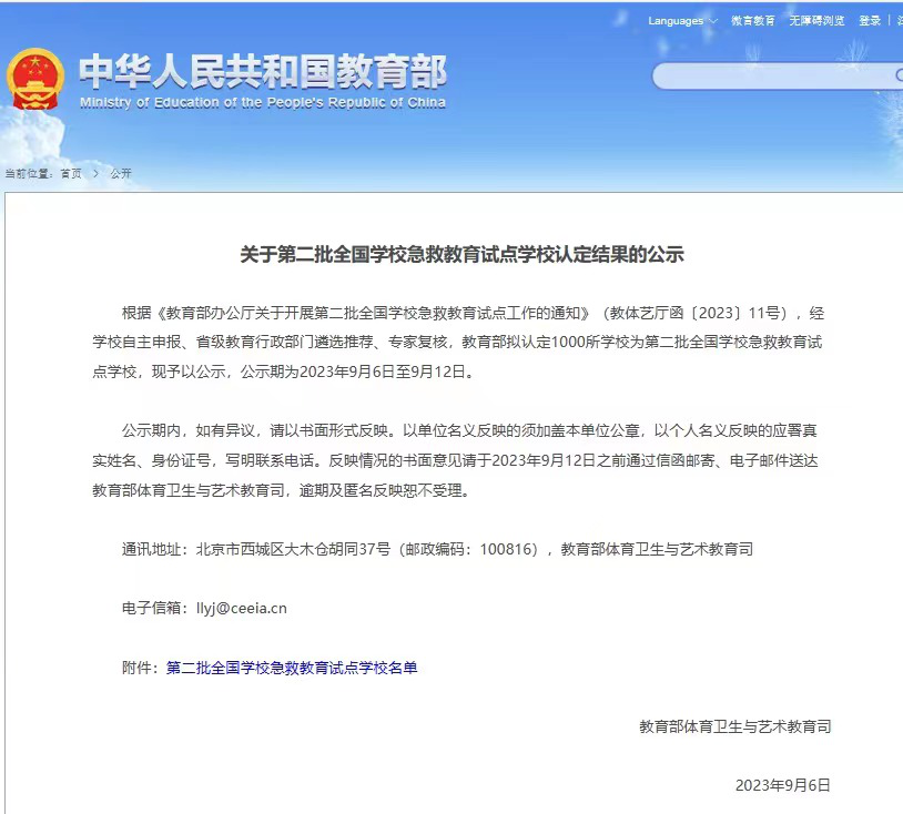 为落实健康第一的教育理念,促进急救知识和技能的普及,学校健康学校建设小组高度重视,全面统筹、深入推进包括急救教育在内的健康学校建设实施方案。根据《教育部办公厅关于开展第二批全国学校急救教育试点工作的通知》(教体艺厅函〔2023〕11号)精神,总务后勤部组织协调申报建设方案,协同相关部门高效完成了申报工作。经省级教育行政部门遴选推荐、专家复核,教育部拟认定1000所学校为第二批全国学校急救教育试点学校,我校名列其中。