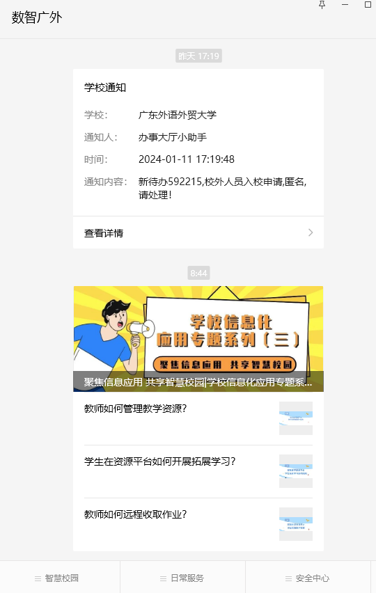 1. 入校申请:有意参与报价者可按下方图片内的流程填写入校申请,先关注“数智广外”公众号——“日常服务”——“入校申请”——“入校申请”(校外人员自助填写),被访人填写“廖春芳”,被访单位选择“总务后勤部”。